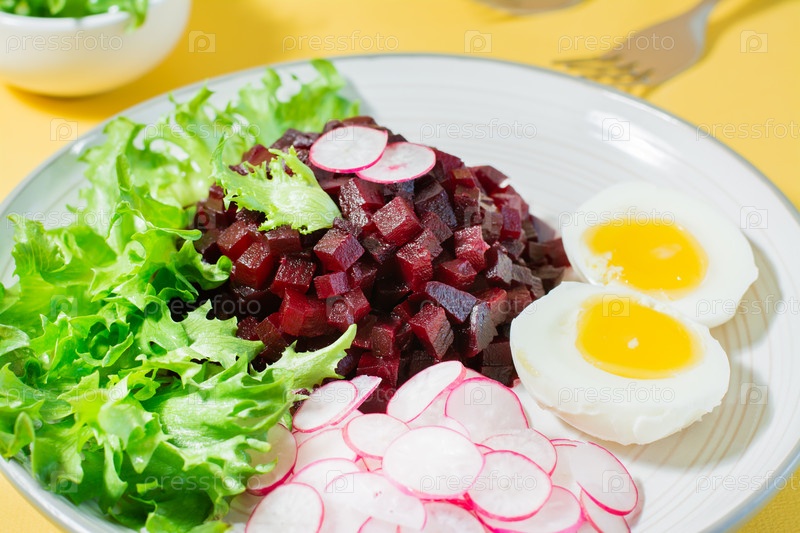 Диетическое блюдо из овощей. Тартар из свеклы, редис, фризовый салат и вареное яйцо на тарелке на желтом фоне. Жесткий свет. Крупный план