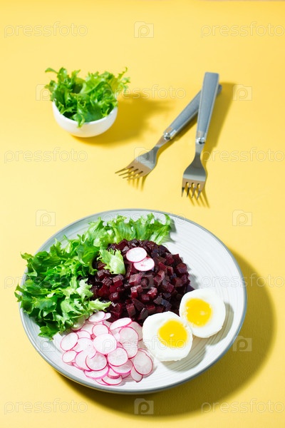 Диетическое блюдо из овощей. Тартар из свеклы, редис, фризовый салат и вареное яйцо на тарелке и вилка на желтом фоне. Жесткий свет. Вертикальный вид