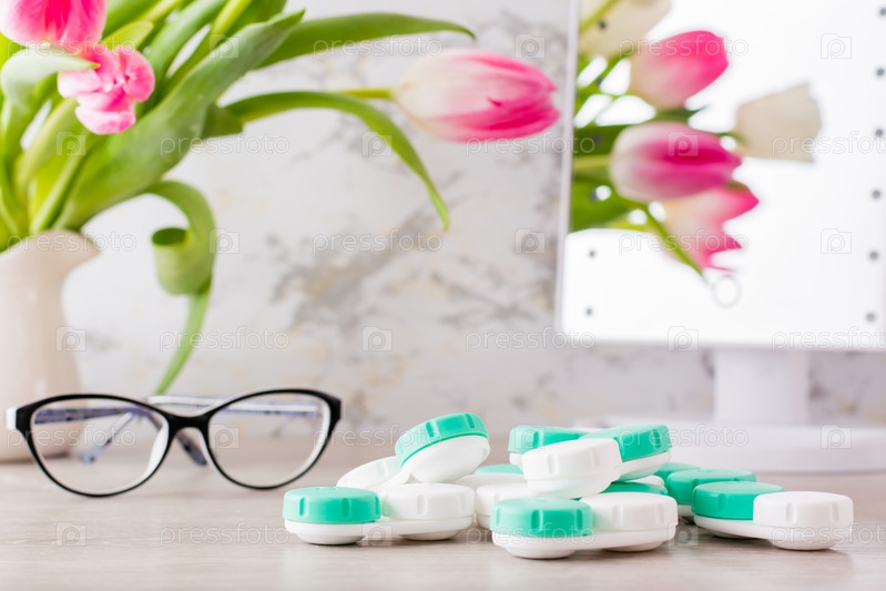 Слабое зрение и выбор между очками и линзами. Куча контейнеров для линз и очков перед зеркалом на столе