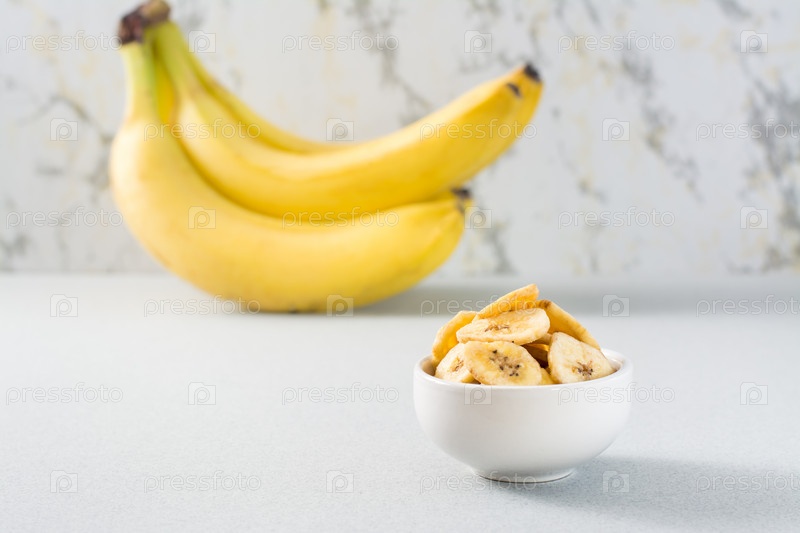 Запеченные банановые чипсы в белой миске и куча бананов на столе. Быстрое питание. Копировать пространство