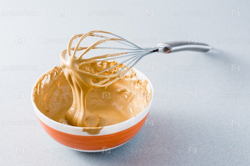 Пена для кофе далгона в миске и венчик на сером фоне