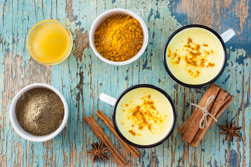 Детокс напиток. Золотое молоко с куркумой и корицей в кружках и ингредиенты для приготовления пищи на деревянном столе. Вид сверху