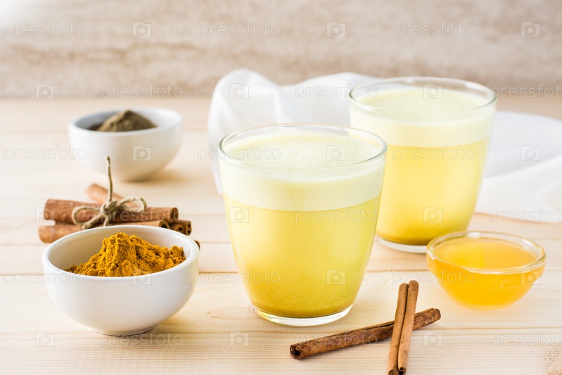 Детокс напиток. Золотое молоко с куркумой и корицей в стаканах на деревянном столе