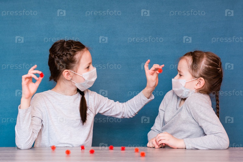 Девочки в медицинских масках на карантине играют в вирусы. Досуг детей в изоляции во время эпидемии
