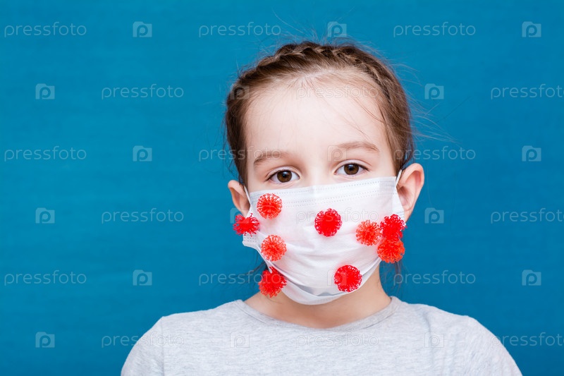 Эпидемия ковид-19. Девушка в медицинской маске, окруженная коронавирусом на синем фоне. Заражение детей