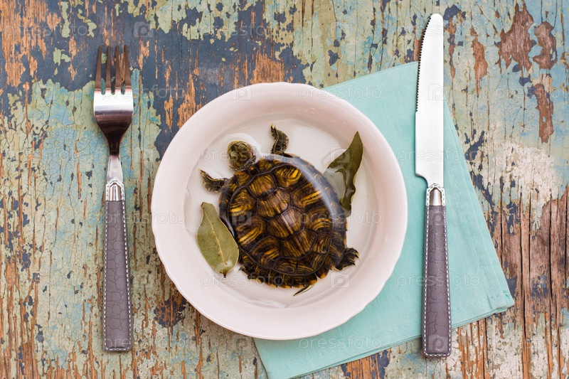 Живая черепаха в тарелке с водой, лавровым листом и столовыми приборами на столе. Имитация черепахового супа. Концепция защиты животных. Вид сверху