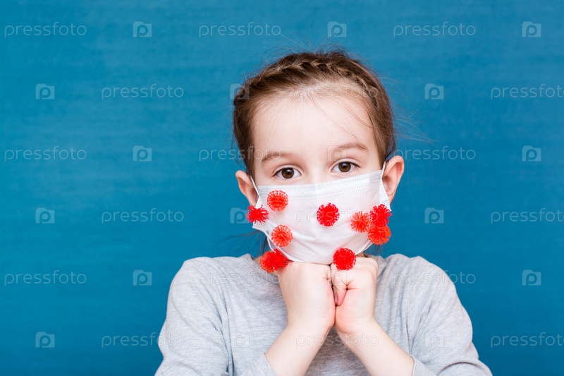 Эпидемия ковид-19. Испуганная девушка в медицинской маске, покрытая коронавирусом на синем фоне. Заражение детей