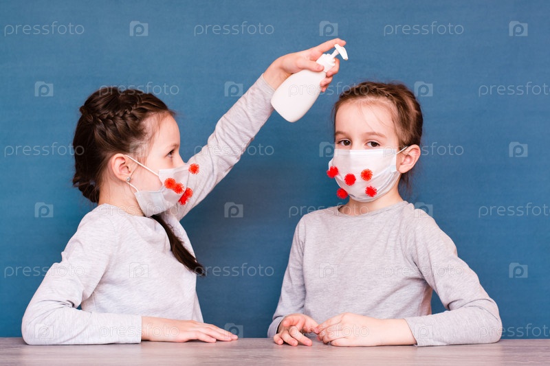 Эпидемия ковид-19. Девушки в медицинских масках, покрытые коронавирусом, обрабатывают друг друга дезинфицирующим средством на синем фоне. Заражение детей