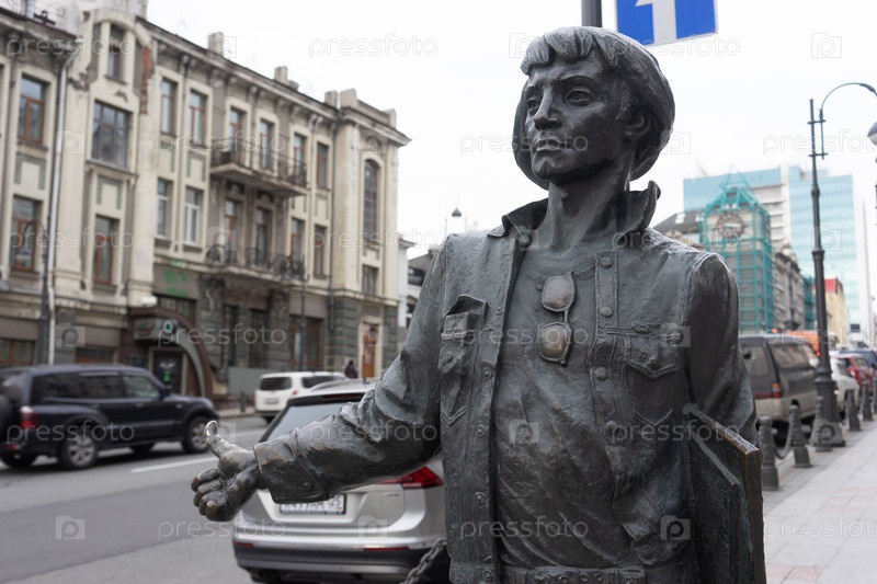 Владивосток, Россия-11 декабря 2018 г.: Городской пейзаж со скульптурой человека