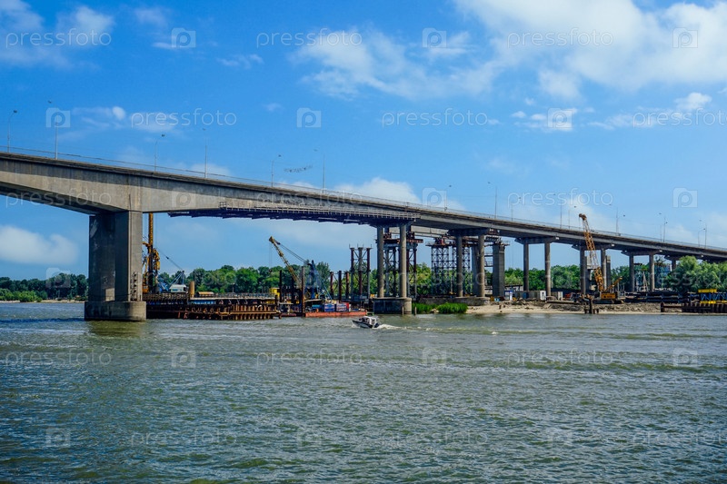 Ростов-на-Дону, Россия - 25 мая 2014 г.: Городской пейзаж с автомобильным мостом через реку