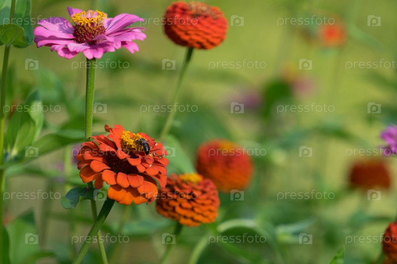 Большой розовый цветок-цинния семейства сложноцветных на ярком размытом зеленом фоне с цветочными пятнами и боке