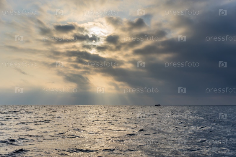 Море в пасмурную и туманную погоду с плавающей лодкой