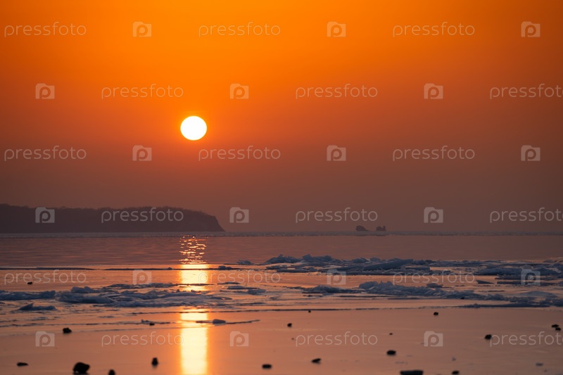 Морской ледяной пляж и красный закат