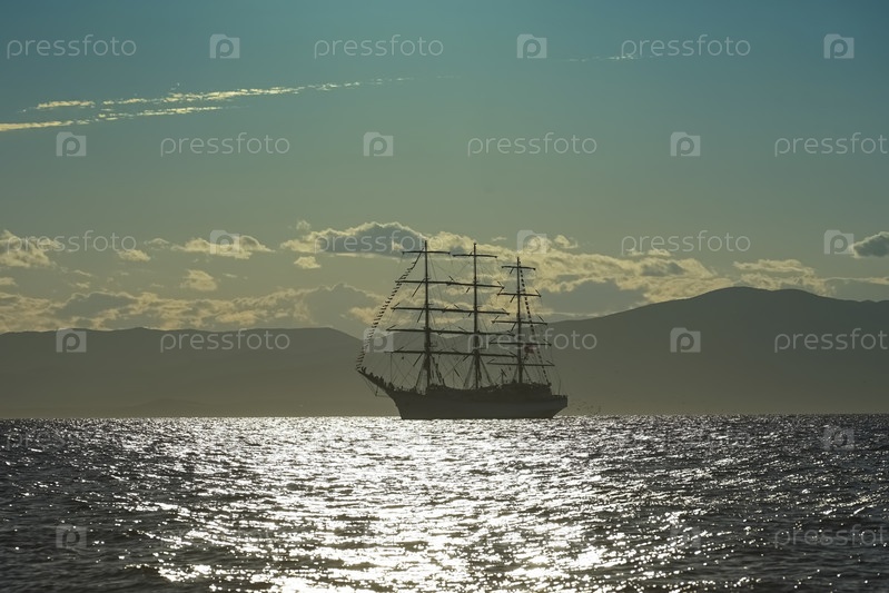 Старинный белый парусник на фоне морского пейзажа
