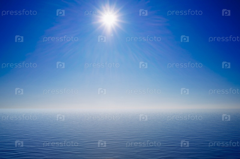 Морской пейзаж с ярким солнцем на голубом небе