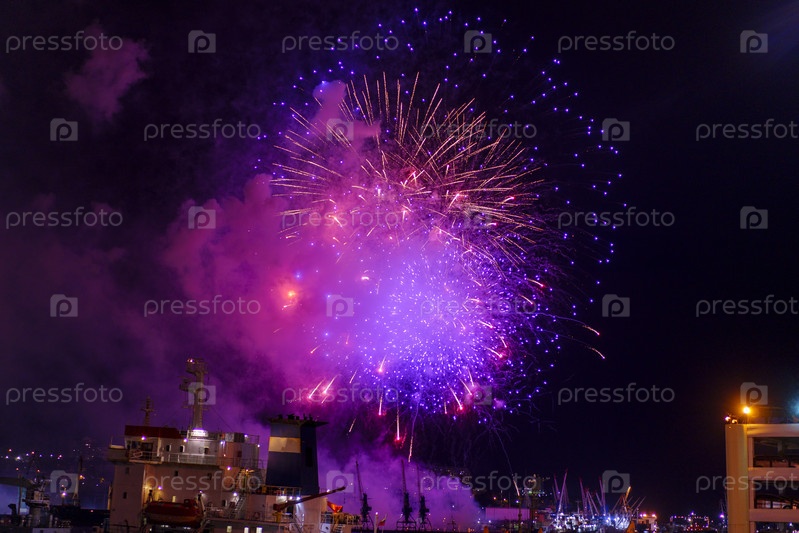 Фейерверк над заливом и портом города. Владивосток, Россия