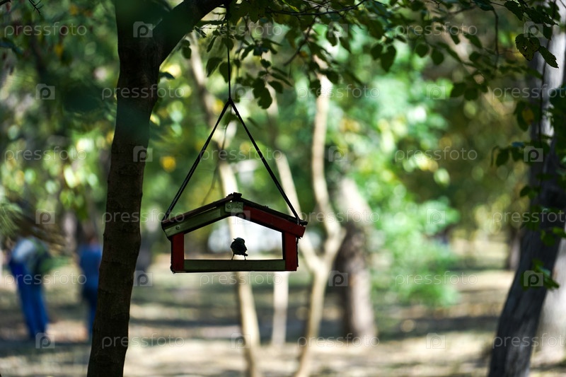 Кормушка для птиц на дереве с птицей в городском парке