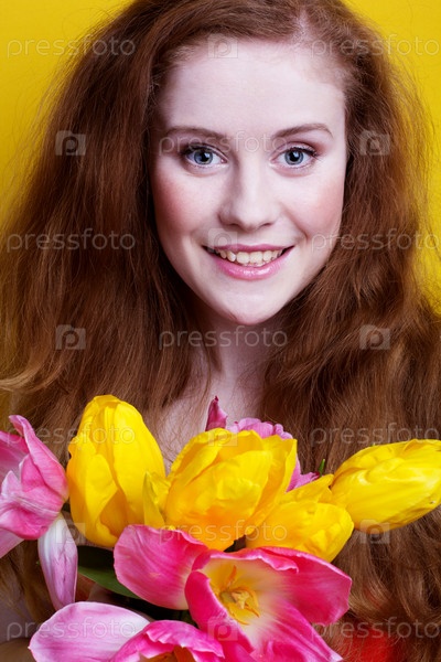 Красивая рыжеволосая девушка с тюльпанами