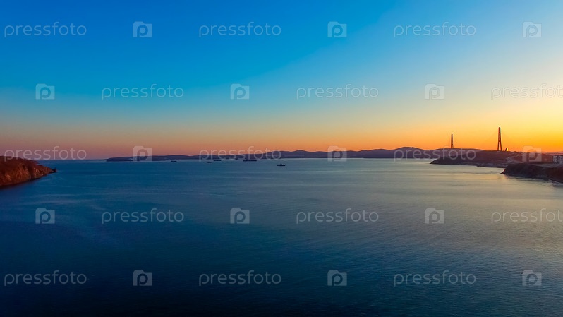 Морской пейзаж с видом на закат и русский мост на горизонте. Владивосток, Россия