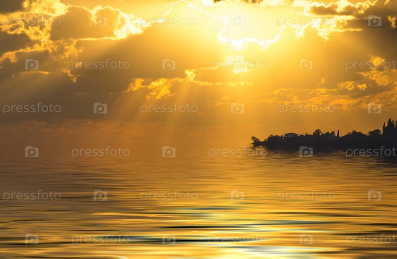 Морской пейзаж с красивым закатом и солнечными лучами