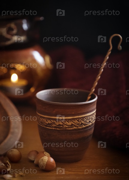 Темный фон с горячим напитком в керамической чашке