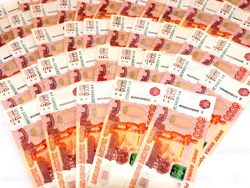 Бумажные банкноты пятитысячных российских рублей, выложенные в виде веера