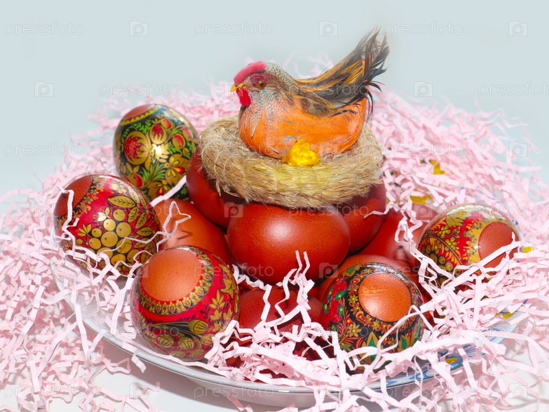 Декоративная фигурка пасхального цыпленка и куча свежих праздничных яиц