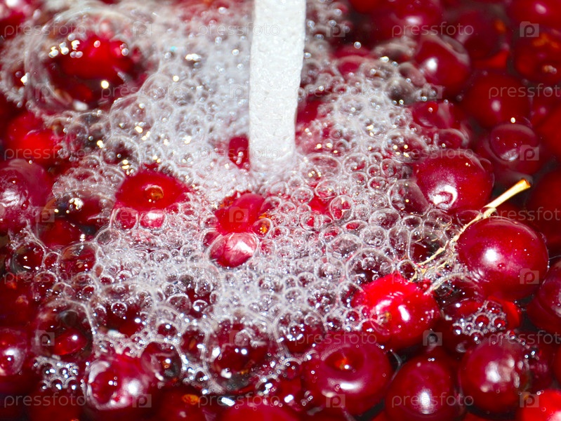 Поток чистой прозрачной воды и букет красных спелых вишен