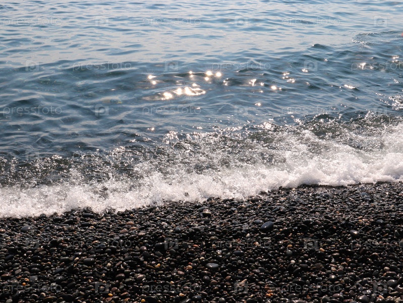 Чистая морская волна падает на галечный пляж в солнечный день