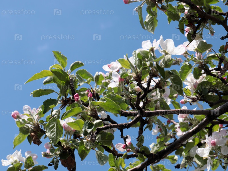 Прекрасные нежные светло-розовые цветы на ветвях яблони и облачном небе