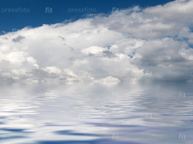 Облака в небе, ярко освещенные солнцем и спокойная гладь океана