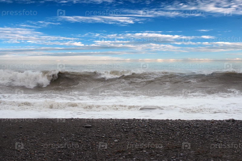 Штормовые волны и галечный пляж на берегу моря