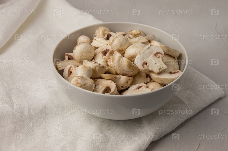 Целые и нарезанные грибы в круглой фарфоровой миске на белом полотенце