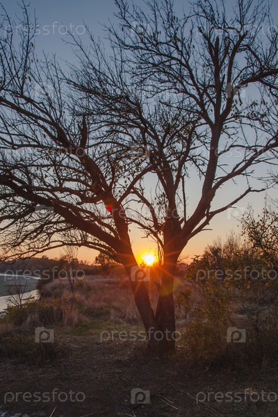 Закат застыл между стволами деревьев. Осенний пейзаж