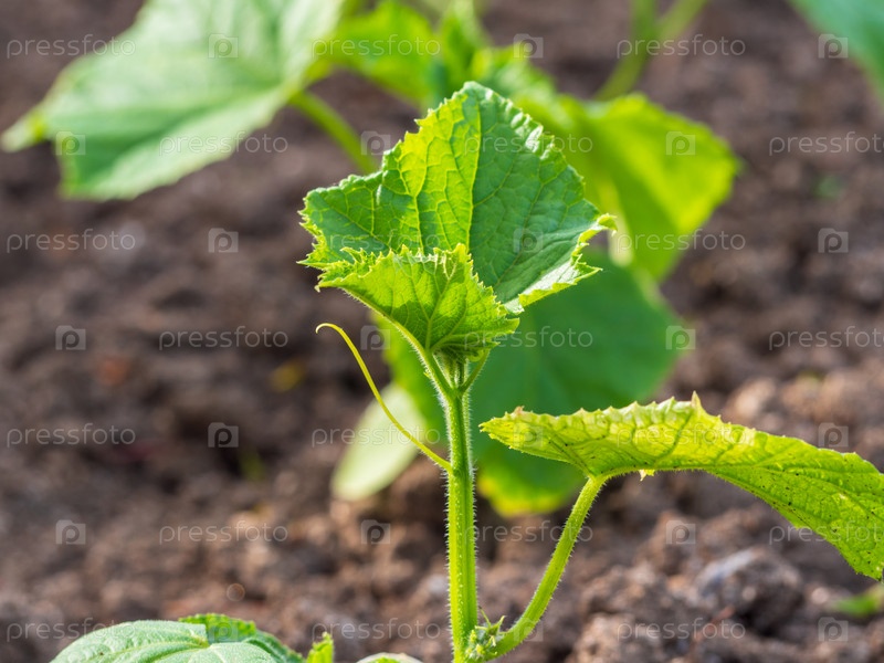 Маленькие зеленые растения огурца, освещенные солнечным светом, растут в земле снаружи. Выращивание овощей