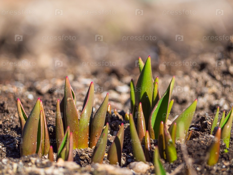 Маленькие ростки тюльпанов в почве весной. Прорастание тюльпанов в саду крупным планом, в полдень под ярким солнечным светом. Группа молодых саженцев тюльпанов прорастает в саду ранней весной
