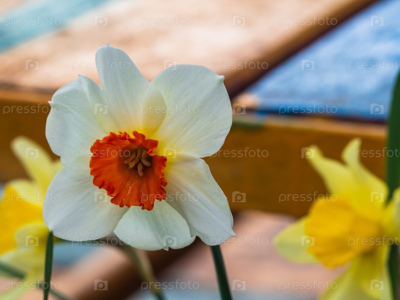 Крупный план белого цветущего нарцисса на размытом фоне, выборочный фокус, место для копирования текста, концепция весенней природы