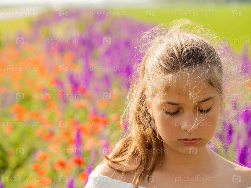 Крупным планом портрет красивой грустной девушки с распущенными светлыми волосами, наслаждающейся природой на открытом воздухе, в цветочном поле. Красивое лицо девочки-подростка крупным планом на фоне цветочного луга