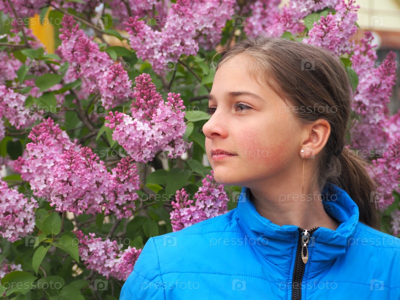 Красивая молодая кавказская улыбающаяся счастливая девушка в синей куртке возле цветущего куста сирени. Великолепная весенняя красота в деревенском стиле. Девочка-подросток смотрит вдаль