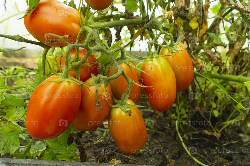 Спелый помидор на ветке в теплице