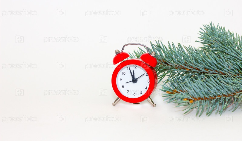 Ретро с красным будильником и еловыми ветками для концептуального дизайна. Рождество и Новый год