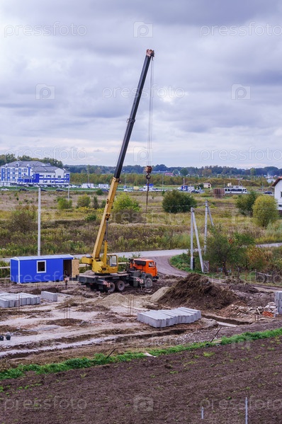 Строительство здания. Строительные и промышленные работы. Кран на территории стенда