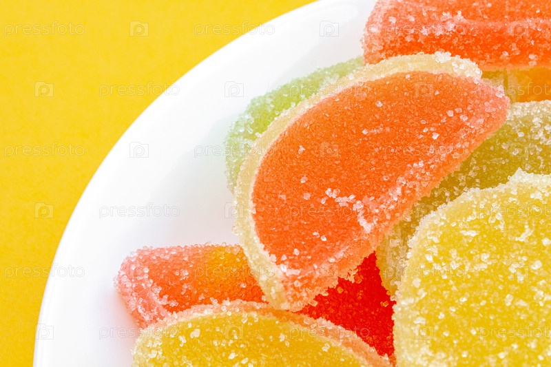 Свежий сладкий мармелад в сахарной крошке в виде ломтиков лежит кучей в белой тарелке на желтом фоне