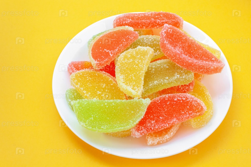 Яркие цветные конфеты, мармелад, сладости в белой тарелке на желтом фоне