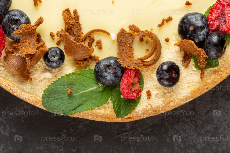 Домашний классический чизкейк на темном фоне. Украшаем сладкий торт свежими ягодами, листьями мяты и соленым сыром