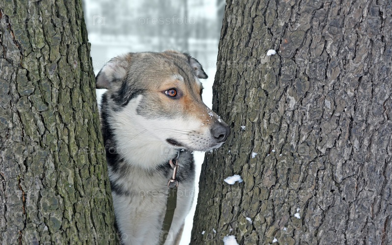Портрет собаки между деревьями зимой