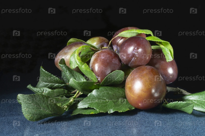 Спелая слива с зеленым листом на черном фоне