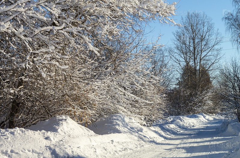 Зимняя дорога в лесу с замороженным деревом