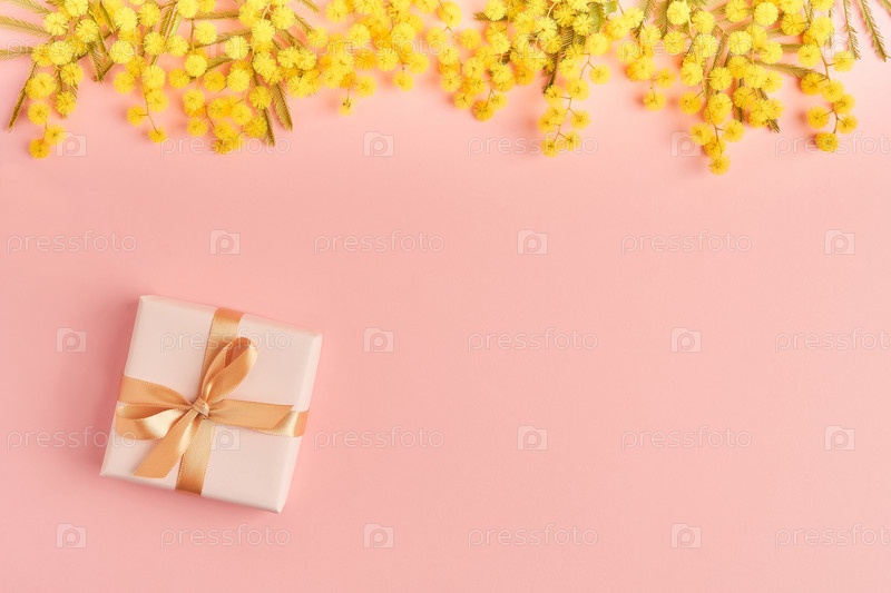 Весенние цветы мимоза с подарочной коробкой на розовом фоне, поздравительная открытка на День матери, 8 марта, Пасха