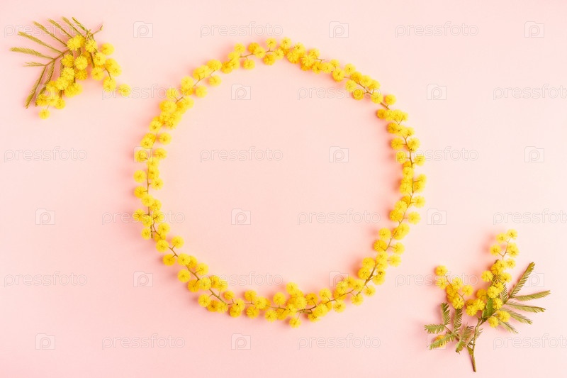 Цветочная композиция. Венок из цветов мимозы на розовом фоне. Поздравительная открытка на День матери, 8 марта, Пасха. Плоская планировка, вид сверху, пространство для копирования